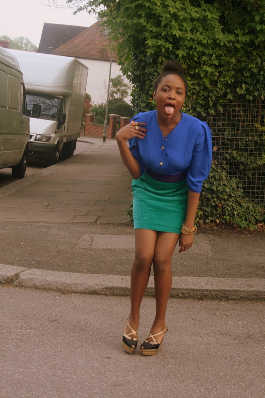 Vintage blouse, H&M skirt, MiuMiu shoes, YSL ring, Grandma's ring, Mawi bracelets, purple vintage belt.